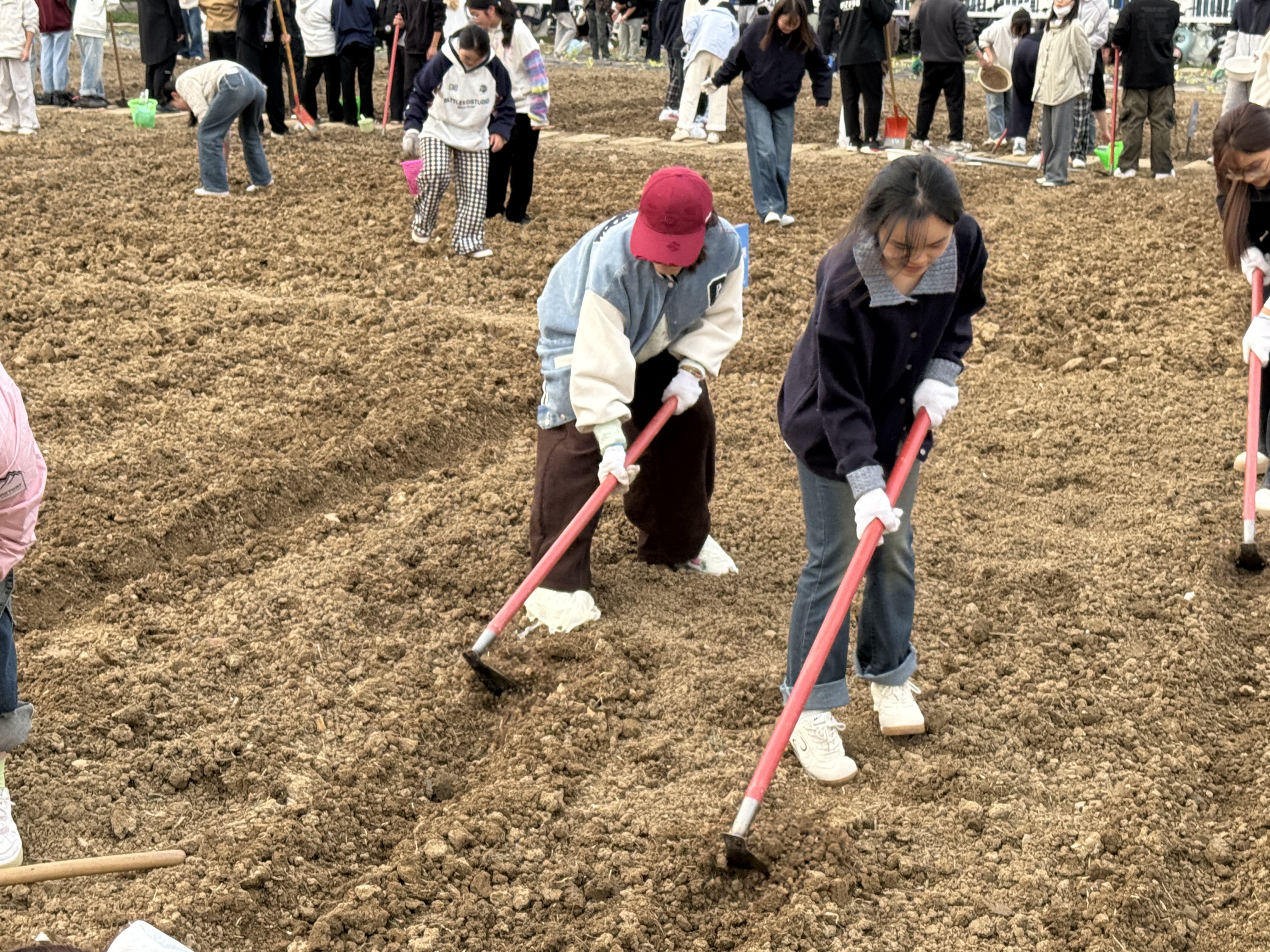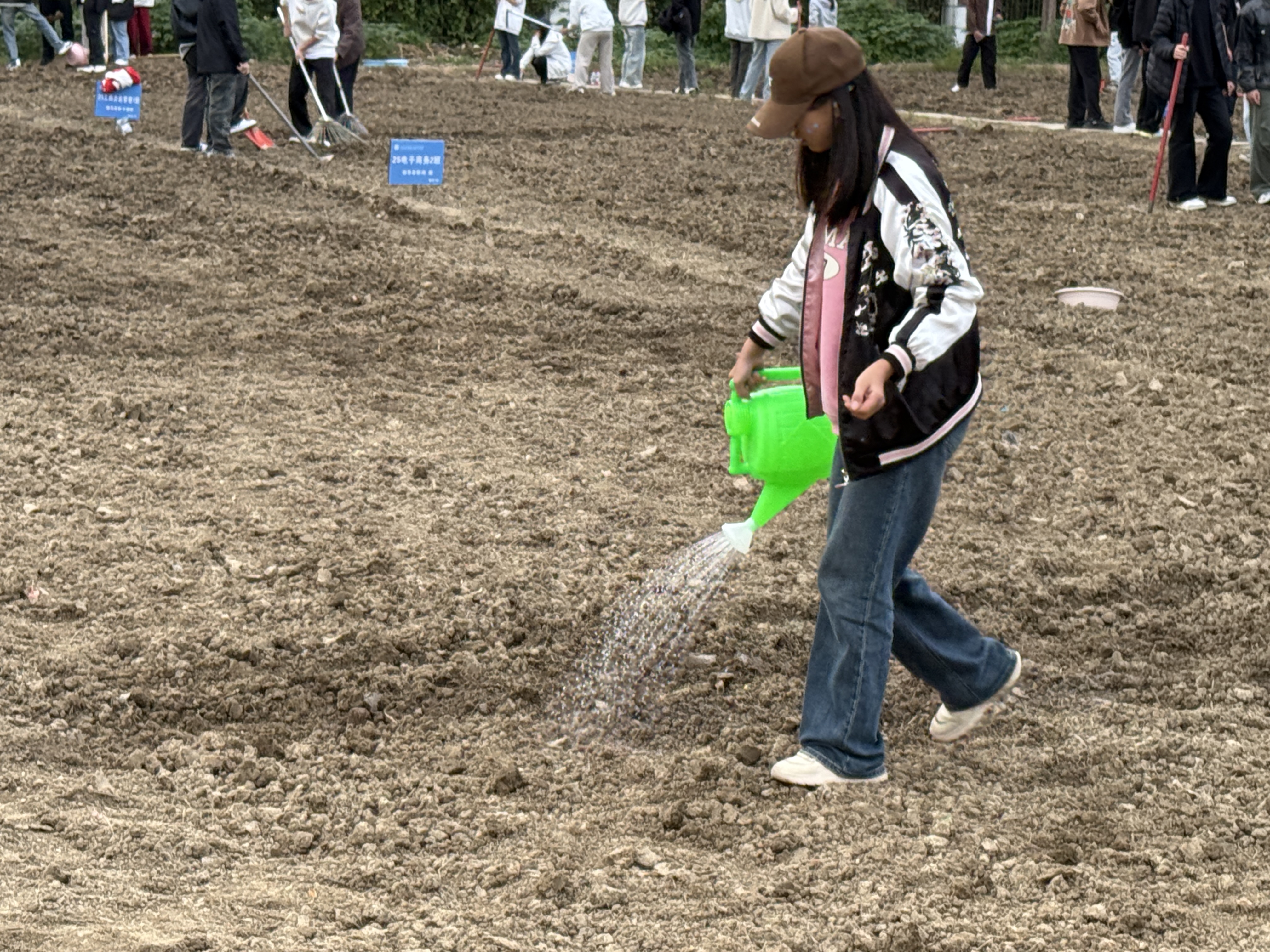 在简短的集中讲解与示范后,各班级学生在指导老师的带领下,有序到达指定责任田区域,兴致勃勃地投入到农作活动中。同学们热情高涨,合理分工,协作默契:有的同学挥动锄头,认真细致地翻垦土地,为种子营造舒适的“温床”;有的同学则按照所学方法,小心翼翼地将种子与泥土混合后进行播撒,期待新生命的萌发;还有的同学紧随其后,及时为播下种子的土地浇灌生命之水。整个农场充满了同学们的欢声笑语和辛勤劳作的身影,气氛活跃而融洽。