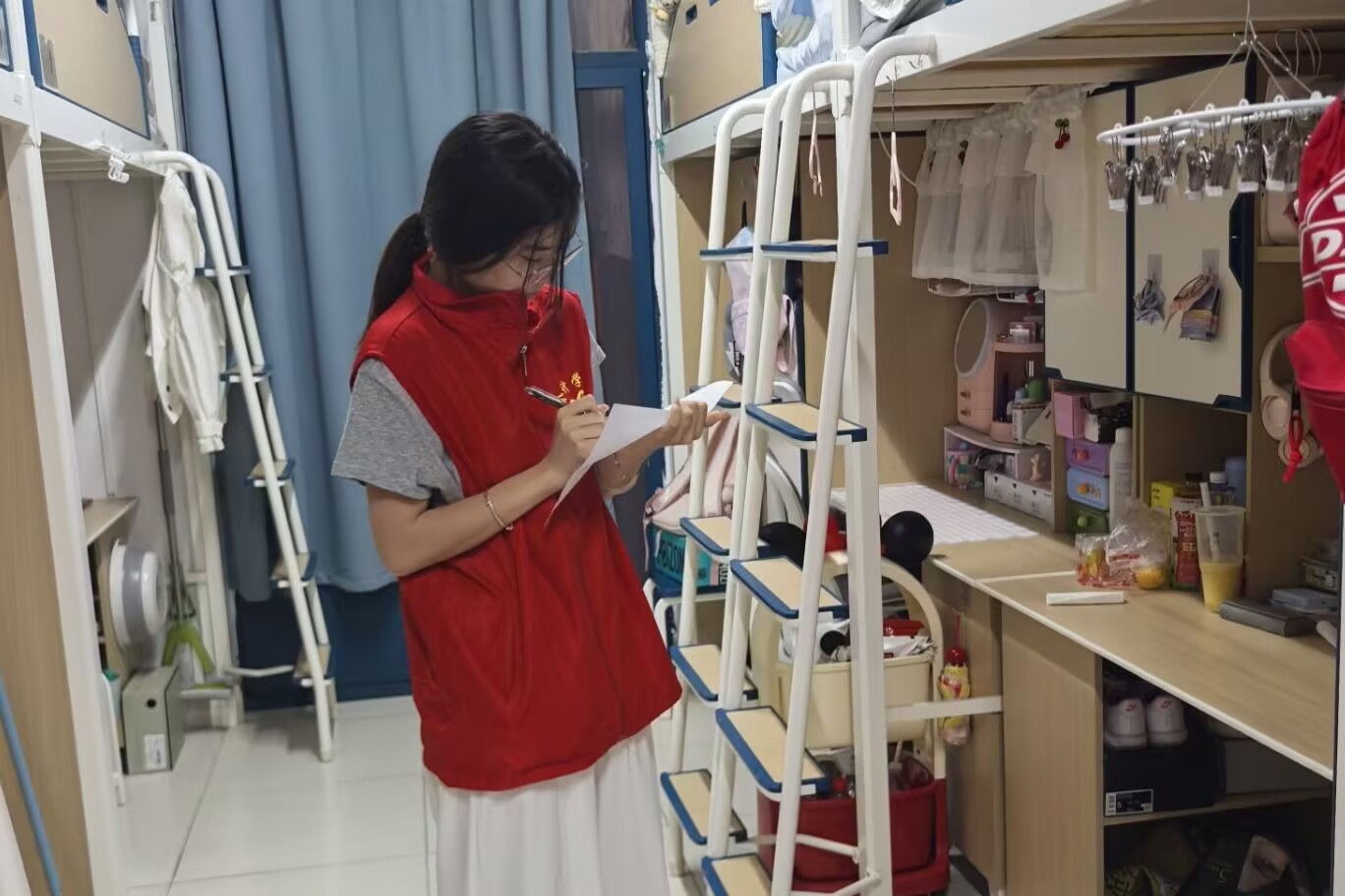 本次评选围绕宿舍整体环境、卫生清洁、物品摆放及宿舍安全等多个方面,严格依据《学生宿舍“内务整理”评分标准》进行量化打分。检查小组深入每间寝室,仔细查看地面是否干净无污渍、洗漱台是否清洁无垢、书桌物品是否整齐有序,并对阳台杂物堆放、卫生间异味等公共区域问题逐一排查。在安全纪律方面,检查组重点排查违规电器使用、私拉电线等安全隐患,坚决杜绝存放易燃易爆物品等行为。