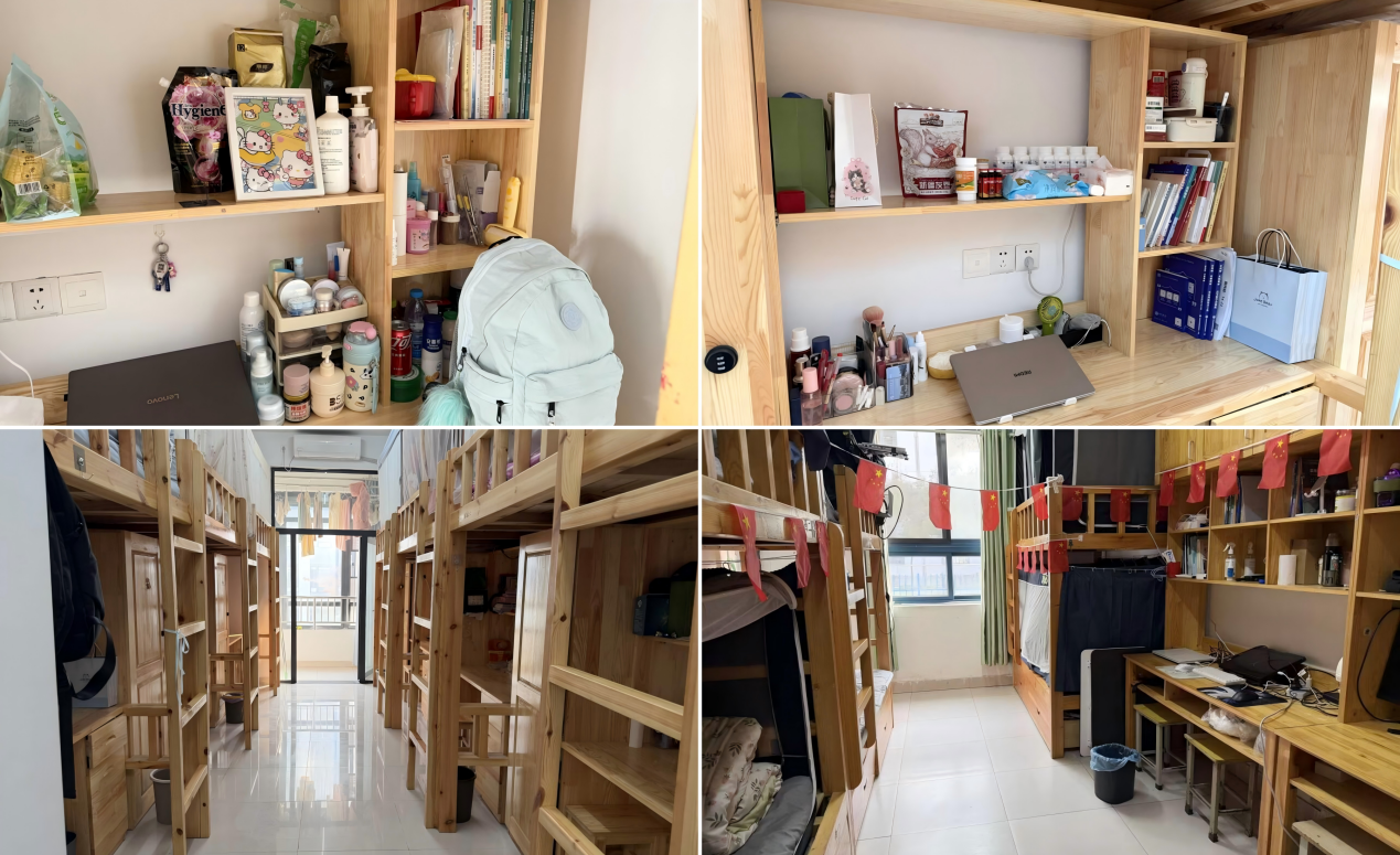 另一处亮点是25新能源汽车班的西六105西宿舍,宿舍采用“红色主题装扮”:小国旗串成的装饰挂满床架,与简洁的木质家具搭配得恰到好处,既展现了青春正能量,又让宿舍氛围格外鲜活。